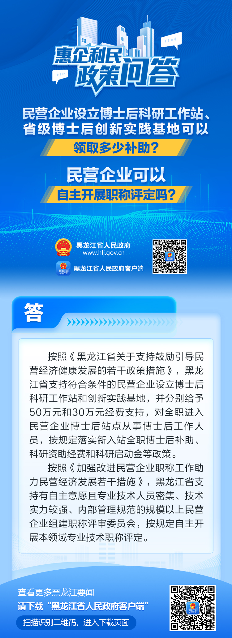 惠企利民政策问答|民营企业设立博士后科研工作站、省级博士后创新实践基地可以领取多少补助?民营企业可以自主开展职称评定吗?