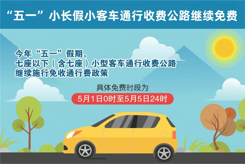 记者从我省交通部门了解到,今年“五一”假期,对行驶收费公路的七座以下(含七座)的载客车辆(以行驶证为准),以及允许在收费公路上行驶的摩托车,均可享受免费通行政策。小型车免费时段为5月1日0时至5月5日24时,一共五天。但需注意,8座和9座的小型客车、8座及以上的载客汽车,以及各类货车和客货两用车,均不在免费范围之内。高速公路以车辆驶离出口收费车道时的联网收费系统时间为准;普通收费公路以车辆通过收费站车道的时间为准。