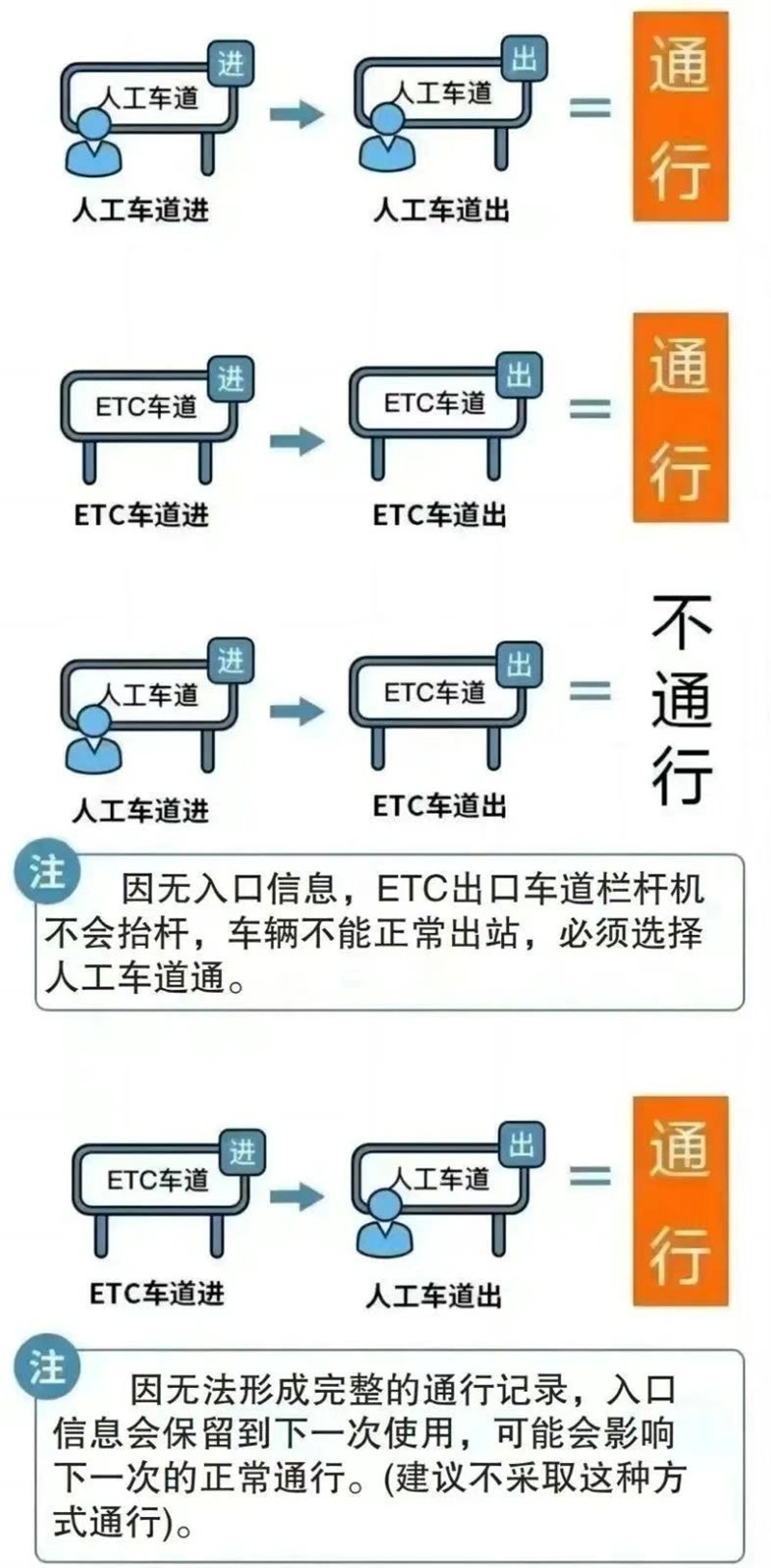 交通运输部门建议车主尽量选择同一类型车道进出高速,特别是从人工通道上高速的ETC车辆,因没有入口信息,出口车道栏杆机不会抬杆,还需折返至人工车道驶出,所以下高速时不要选择ETC通道,以免耽误您的行程。