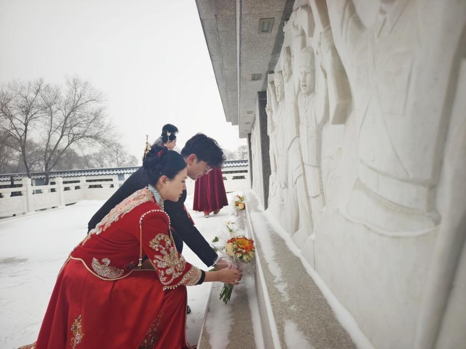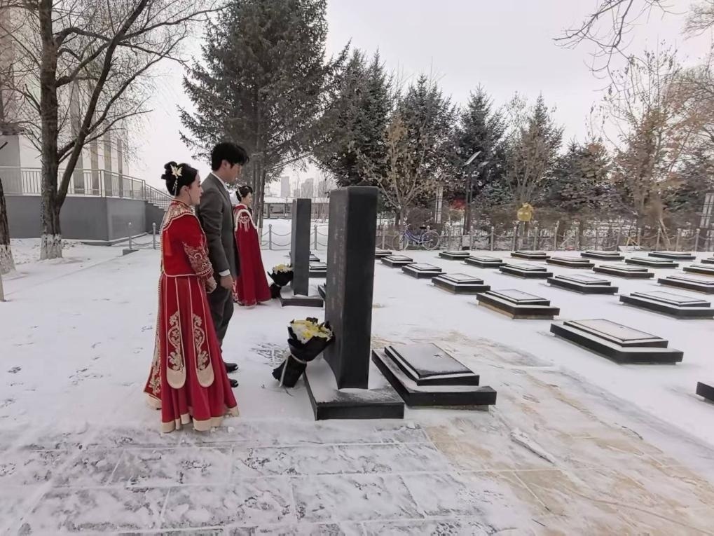 12月19日,黑龙江省绥化市英烈园开展了一场“执子之手 致敬山河”新婚夫妇致敬先烈主题活动。在激昂的国歌中,全体人员肃立聆听,旋律激荡着家国情怀;短暂的默哀时光里,风雪不语,哀思绵长。