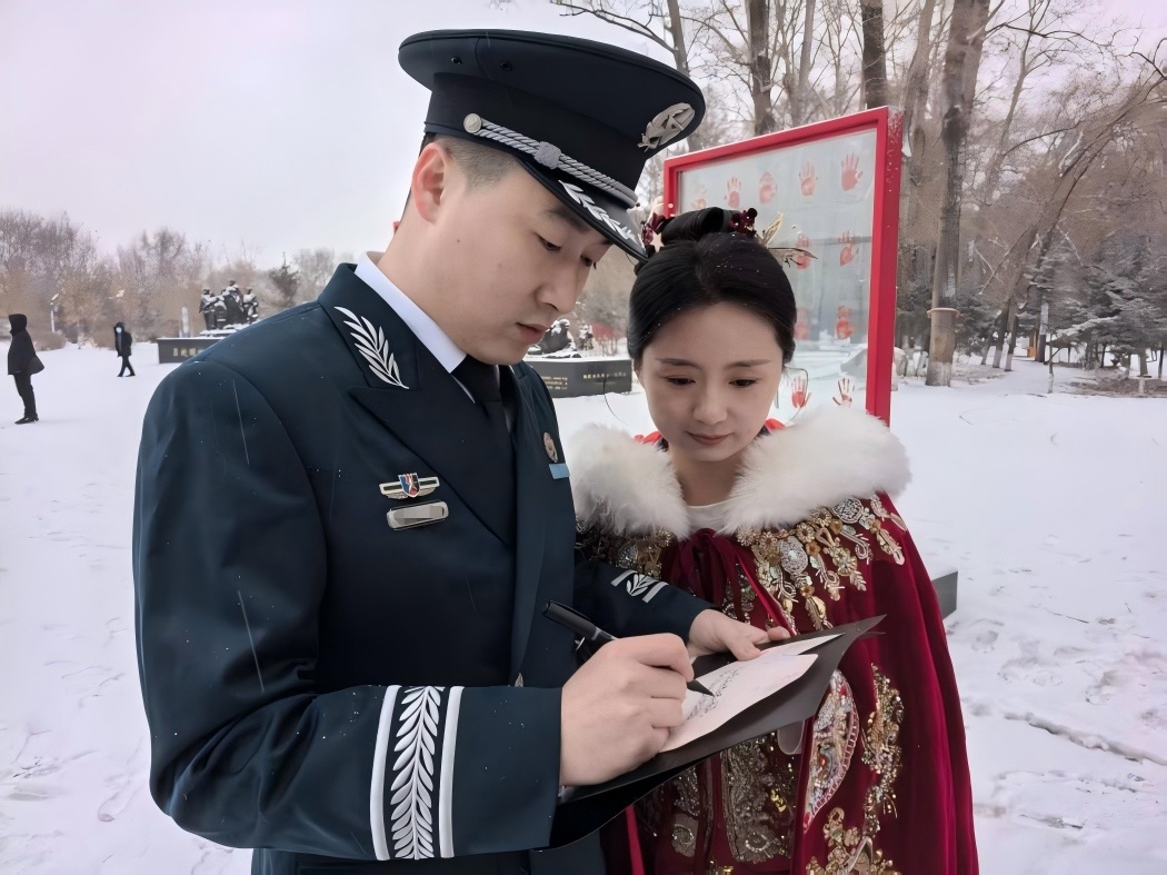 岁末冬深,雪落倾城,绥化市英烈园的每一寸土地,都浸着岁月的肃穆与深情。在一张张精心设计的卡片上,字里行间满是新婚的赤诚与对英烈的敬慕——“以吾辈红妆,赴盛世之约,英烈风骨,吾辈传承”“我们想带您踏遍祖国山河,亲眼见证这国泰民安!”……这是新人写给英烈的专属告白,也是一场跨越时空的精神对话。