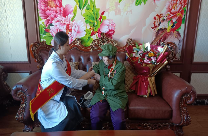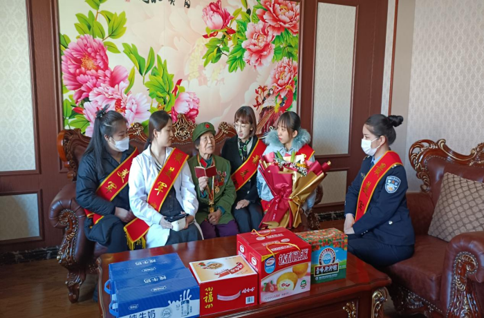 节日前夕,5位“最美军嫂”来到老年公寓,看望穆棱市抗美援朝老战士蔡明子,为老人送去了慰问品和鲜花,军嫂刘明慧还为老人测量了血压。军嫂们认真倾听老战士讲述往昔参战的经历,并向老人为党和国家作出的贡献致以崇高的敬意。