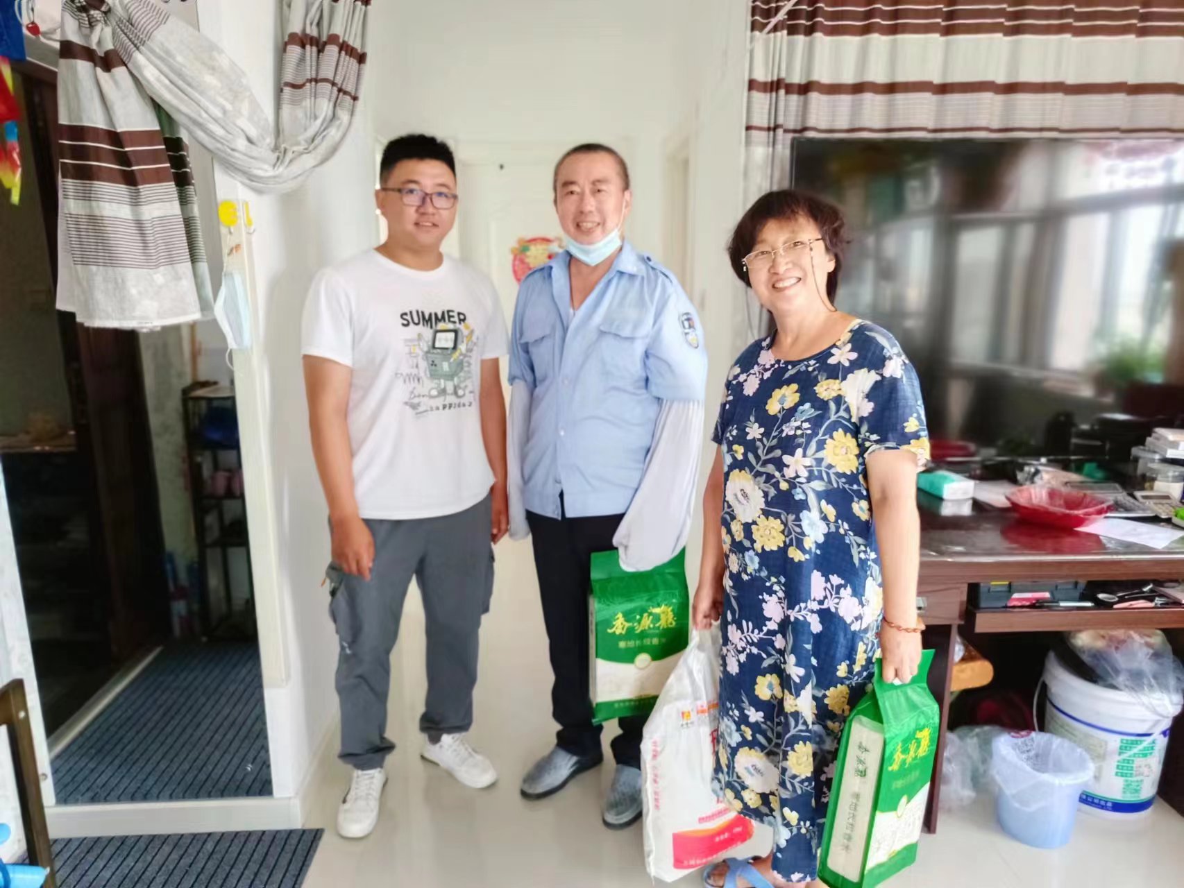 图3:绥化荣硕饮品捐赠米面等慰问物资,图为工作人员为退役军人代表发放。